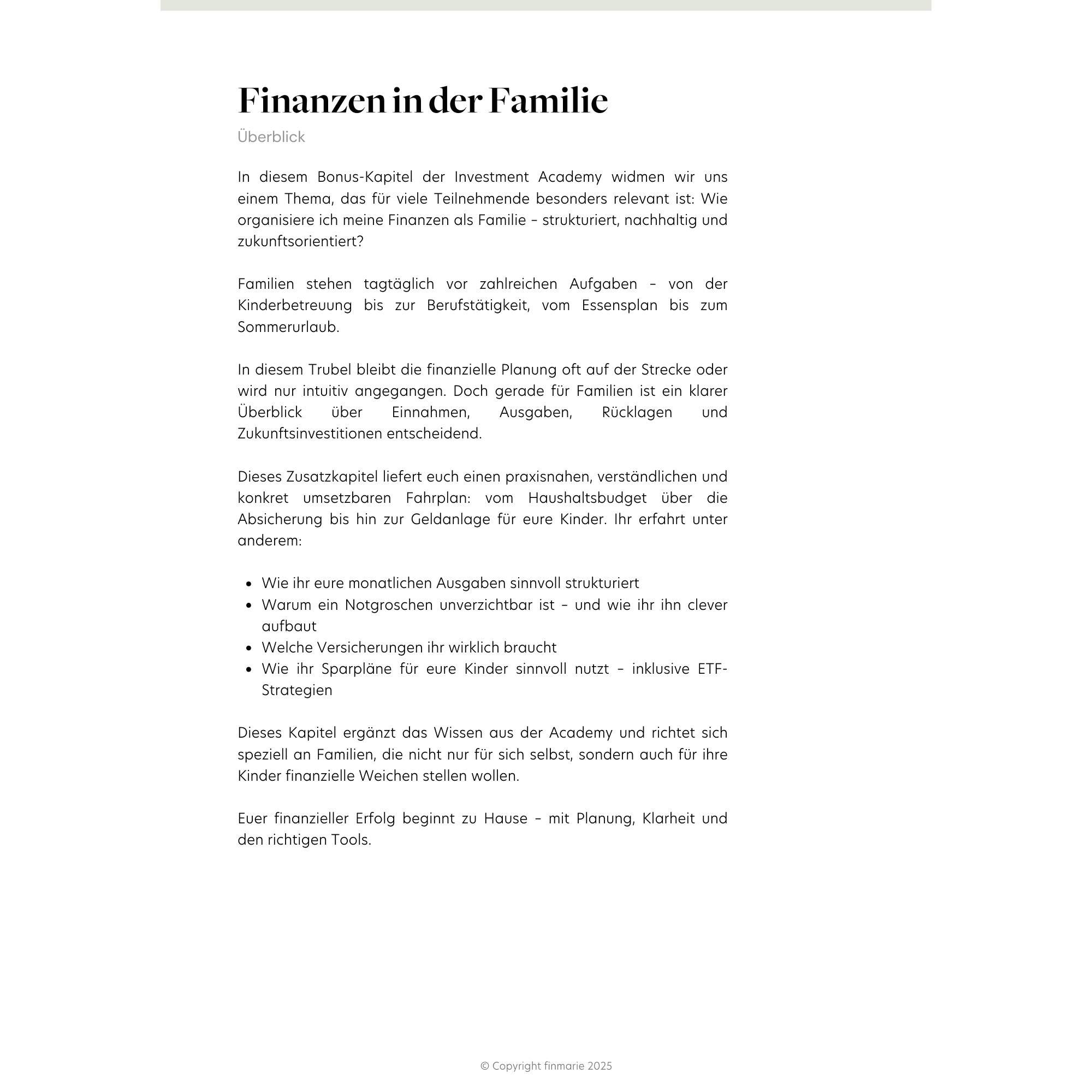 Familie & Finanzen ist ein Bonus-Modul unseres 8-wöchigen Investment-Academy-Programms und umfasst 7 Videos plus ein zusätzliches Extra-Video zu den finanziellen Scheidungsfolgen.